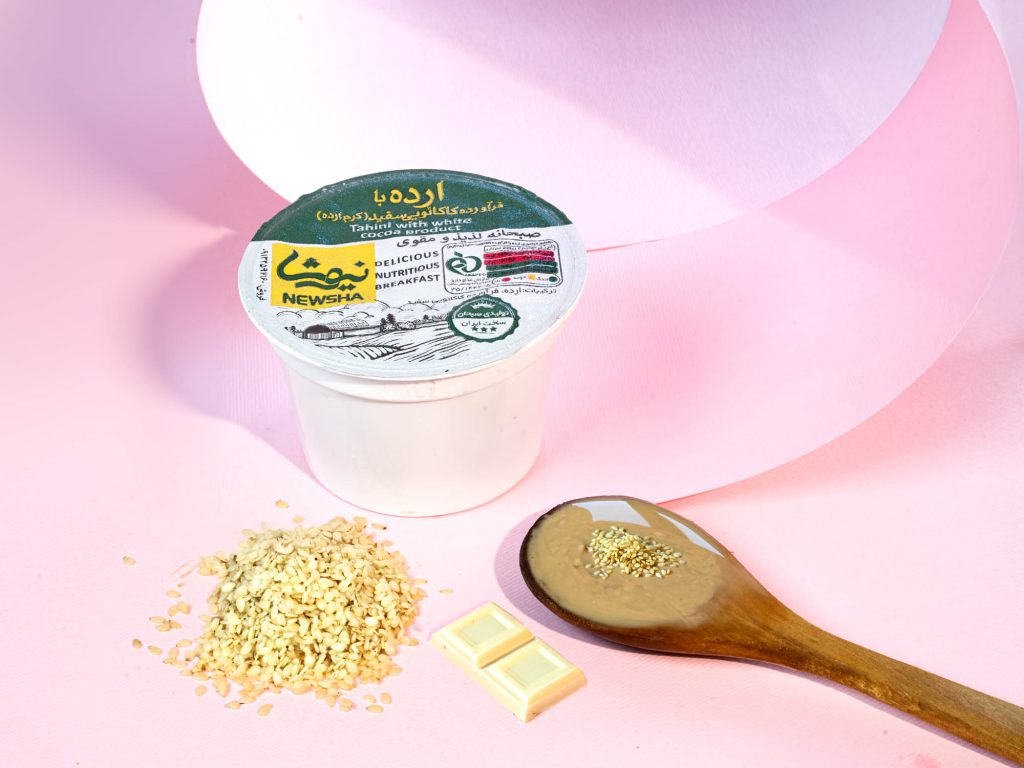 ارده با فرآورده کاکائویی سفید نیوشا محصولی منحصربهفرد و خوشطعم است که از ترکیب ارده خالص کنجدی اردکان و فرآورده کاکائویی سفید باکیفیت تهیه میشود.